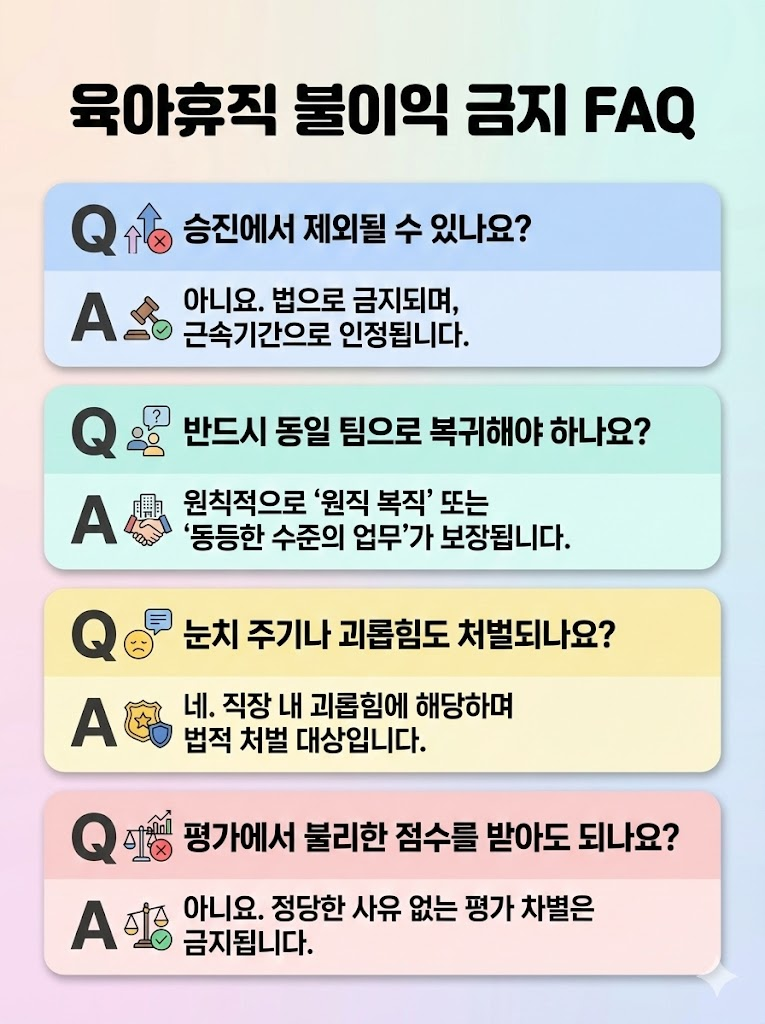 육아휴직에서 불이익 금지 규정은 직장 부모를 가장 강하게 보호하는 장치 중 하나입니다. 제도를 잘 알고 준비하면, 눈치 보지 않고 권리를 사용하는 데 큰 도움이 됩니다.