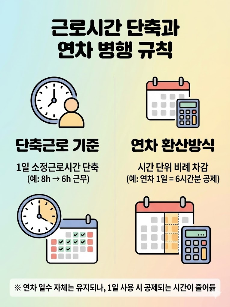 - 이 경우 연차 1일 사용 시 = 4시간 유급 처리(단축된 근로시간 기준)