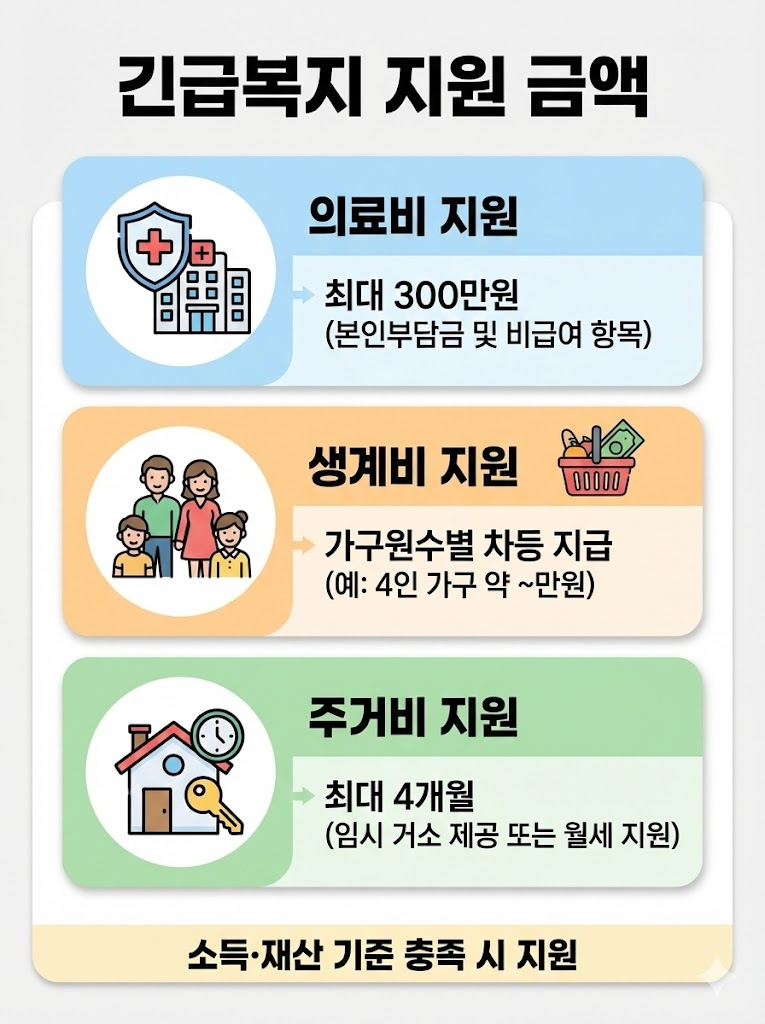 2026년 긴급복지 의료·생계·주거 지원을 한눈에 정리했습니다. 갑작스러운 병원비·월세 체납·소득 중단 위기 때 받을 수 있는 지원 금액, 위기 판정 기준과 신청 절차를 안내합니다.