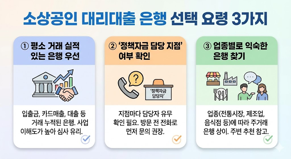 협약 은행이라면 기본적으로 대리대출 취급이 가능하지만, 모든 지점이 정책자금에 익숙한 것은 아닙니다. 따라서 다음 기준으로 은행을 선택하면 실제 승인까지 훨씬 수월해집니다.