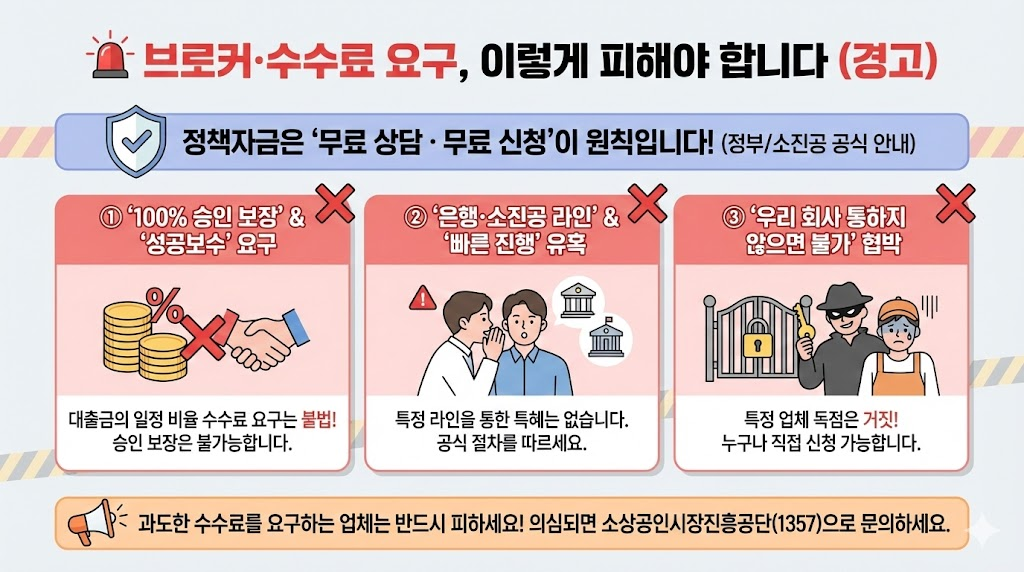 정책자금이 널리 알려지면서, 이를 빌미로 성공보수·컨설팅 수수료를 요구하는 브로커들도 함께 늘었습니다. 정부와 소진공은 반복해서 “정책자금은 무료 상담·무료 신청”이라고 안내하고 있습니다.